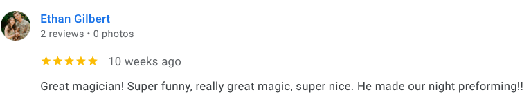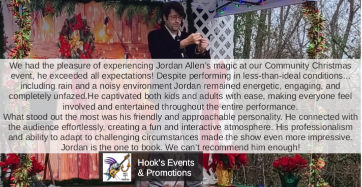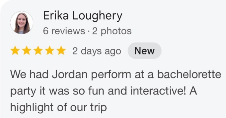 ” I had so much fun at this performance, it’s one of my favorites at the festival! Jordan has a great stage presence, tricks, and anecdotes that marry into a fun engaging magic show!” – Hannah May, (Seance Sisters, KC Fringe 2024)